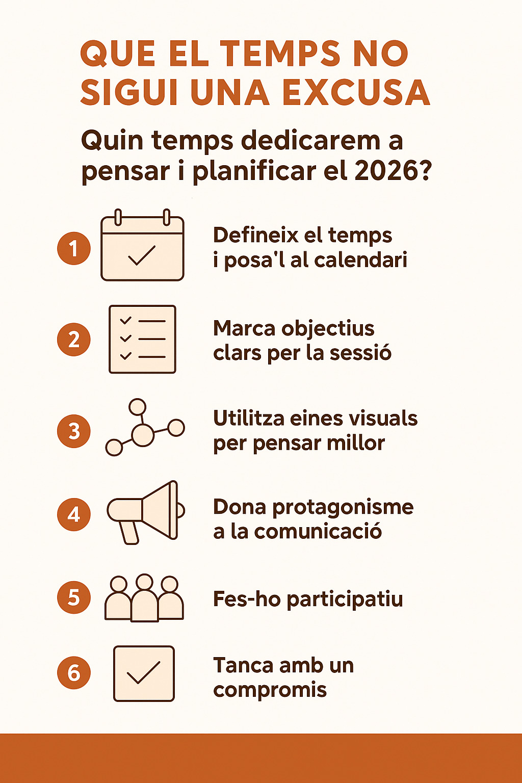 Planificar no és un luxe, és una necessitat. Dedicar temps a la direcció i gestió és invertir en la missió, en la sostenibilitat i en la capacitat d’impacte. Que el temps no sigui una excusa: reservar espais per reflexionar és el que ens permet avançar amb sentit i no només apagar focs.